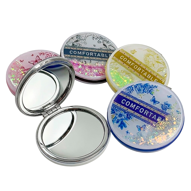 Зеркало круглое 7 см. с блестками "Comfortable". Складное карманное зеркало (двойное). Стильное и компактное складное зеркальце — незаменимый аксессуар в сумочке каждой девушки. Особенность этой модели — яркая крышка с подвижными блестками, которые красиво переливаются на свету, Зеркальце имеет две стороны: одна сторона с небольшим увеличением для более детального осмотра, а другая - с обычным отражением. Эта позиция — идеальный вариант для прикассовой зоны, магазинов косметики и подарков