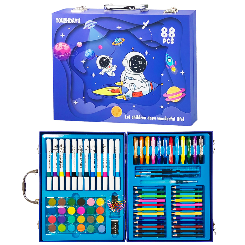 Набор для творчества 88 предметов "Космос" в картонном чемоданчике. Яркий и практичный набор для рисования и творчества — отличный подарок для детей и взрослых, которые любят создавать красивые рисунки и пробовать разные художественные техники. Всё необходимое для рисования, раскрашивания и экспериментов с цветом собрано в одном наборе.