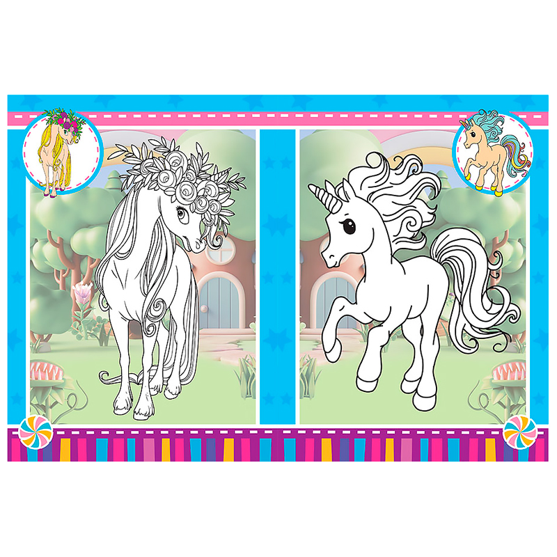Раскраска с наклейками А4, 126 наклеек P30-698, 10 стр. Обложка украшена глиттером, на каждой странице цветной фон, пазл, маска