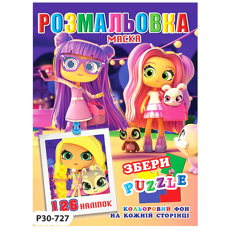 Раскраска с наклейками А4, 126 наклеек P30-727, Раскраска включает 10 страниц и 126 ярких наклеек, которые помогут сделать процесс творчества еще более увлекательным. Эта раскраска не только развивает воображение и творческие навыки ребенка, но и тренирует мелкую моторику. Обложка украшена глиттером, на каждой странице цветной фон, пазл, маска