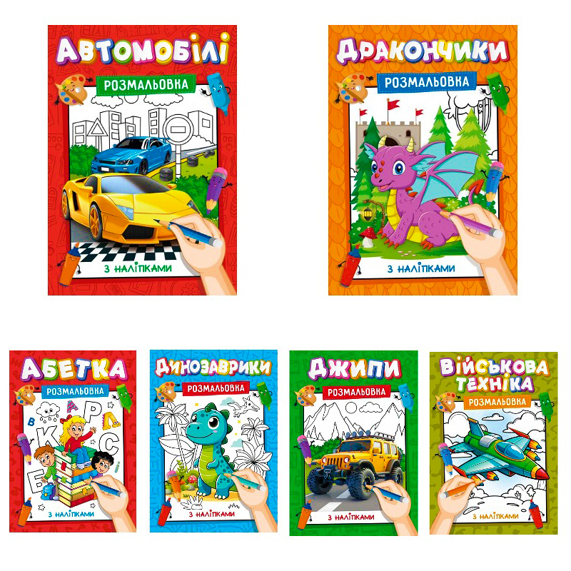 Раскраска А4 с наклейками-подсказками 16 стр.для мальчиков (укр.). Обложка - цветная,, картон хром-эрзац. Блок - офсет 70 г/м2, наклейки с подсечкой