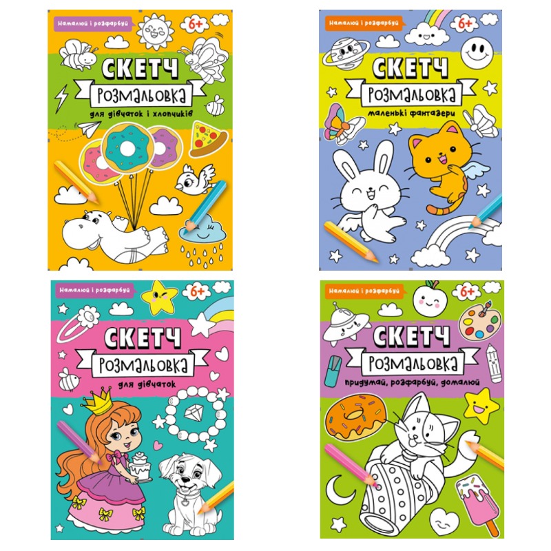 Скетч-раскраска 200мм х 260мм, 32 стр.(укр.). Подходит для развития воображения, снятия стресса и творческого досуга.Формат 200мм х 260мм, обложка - целлюлозный картон 215 г/м², полноцветная, 4+0, УФ-лак, внутренний блок - офсетная бумага 90 г/м², 32 стр., 1+1, скоба.