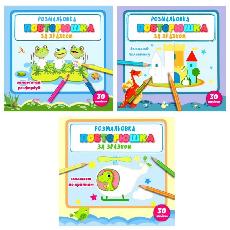 Раскраска "повторюшка" по образцу 215мм х 205мм, 12 стр.(укр.) Эта раскраска сочетает обучение и игру: малыш учится повторять рисунки по образцу и украшает их наклейками, что делает процесс веселым и увлекательным. Предназначена для развития у детей внимательности, усидчивости и творческих навыков. Обложка-целлюллозный картон 215 г/м², поноцветная+УФ лак. Скоба. Внутренний блок полноцветный, офсет 100 г/м²; 12 страниц+ самоклейка.