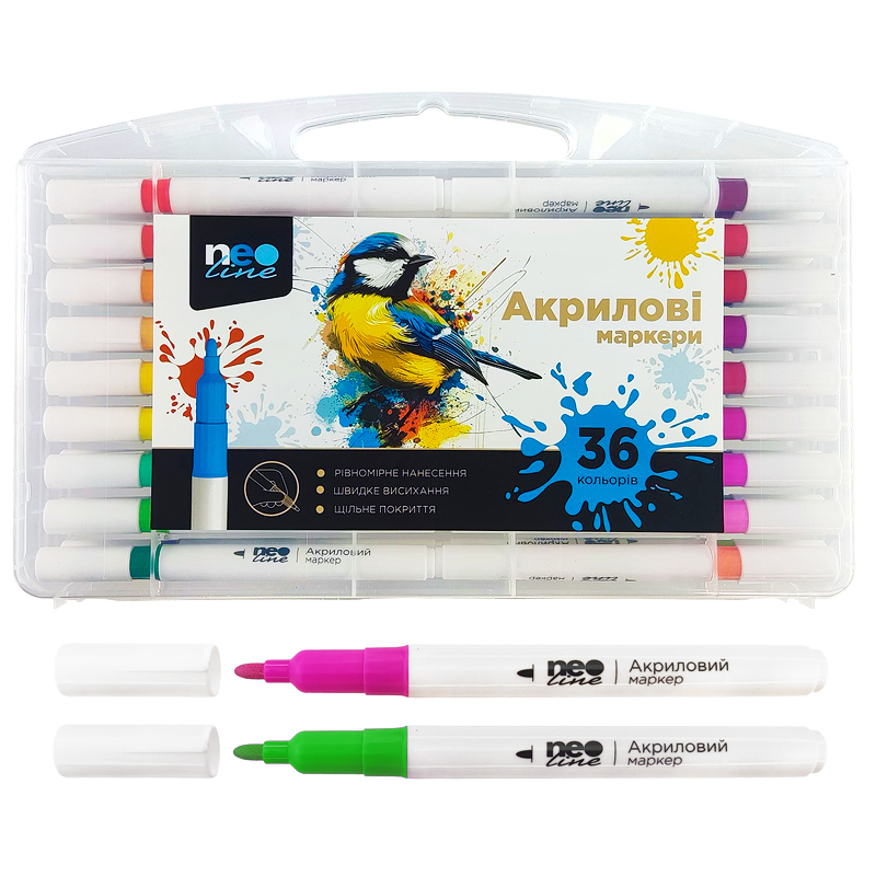 Набор акриловых маркеров 36 цветов в пластиковом футляре. Набор акриловых маркеров — это идеальный выбор для творчества, декора и хобби. В комплекте 36 ярких, насыщенных цветов, которые обеспечивают ровное нанесение и плотное покрытие на различных поверхностях: бумаге, картоне, дереве, стекле, керамике и камне. Удобный пластиковый кейс с ручкой для хранения и транспортировки