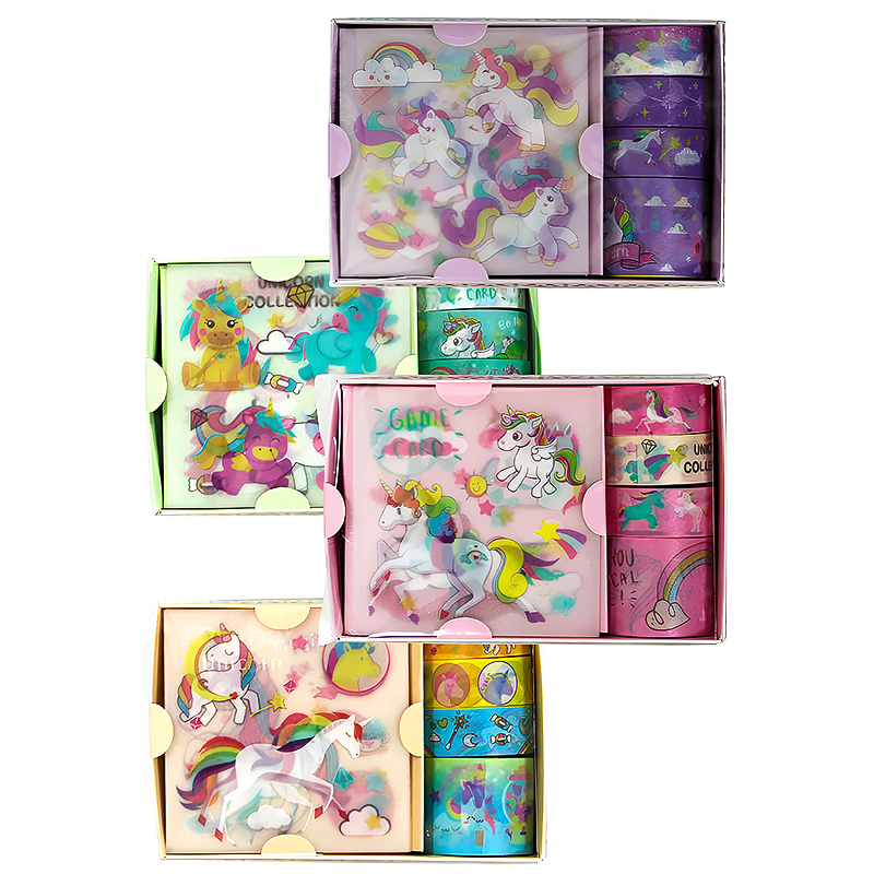 Набор: наклейки + декор-скотч "Единороги" DJS08. Яркий набор для творчества и оформления: наклейки с единорогами и бумажный декор-скотч . Отлично подойдёт для скрапбукинга, ведения блокнотов, украшения писем, упаковки подарков и декора. В наборе 4 ленты размером 3*1,5 см., 1*3 см.