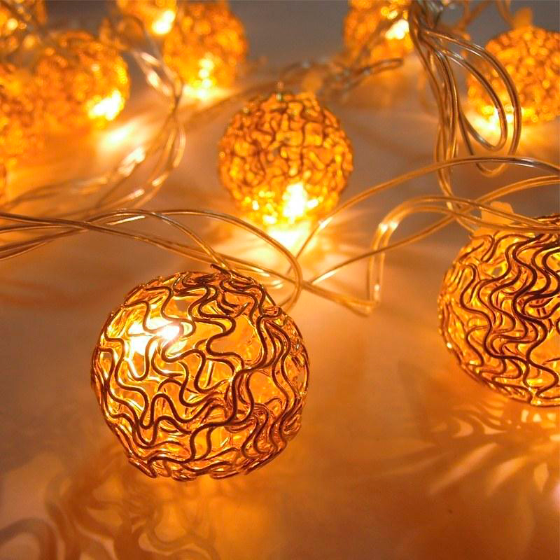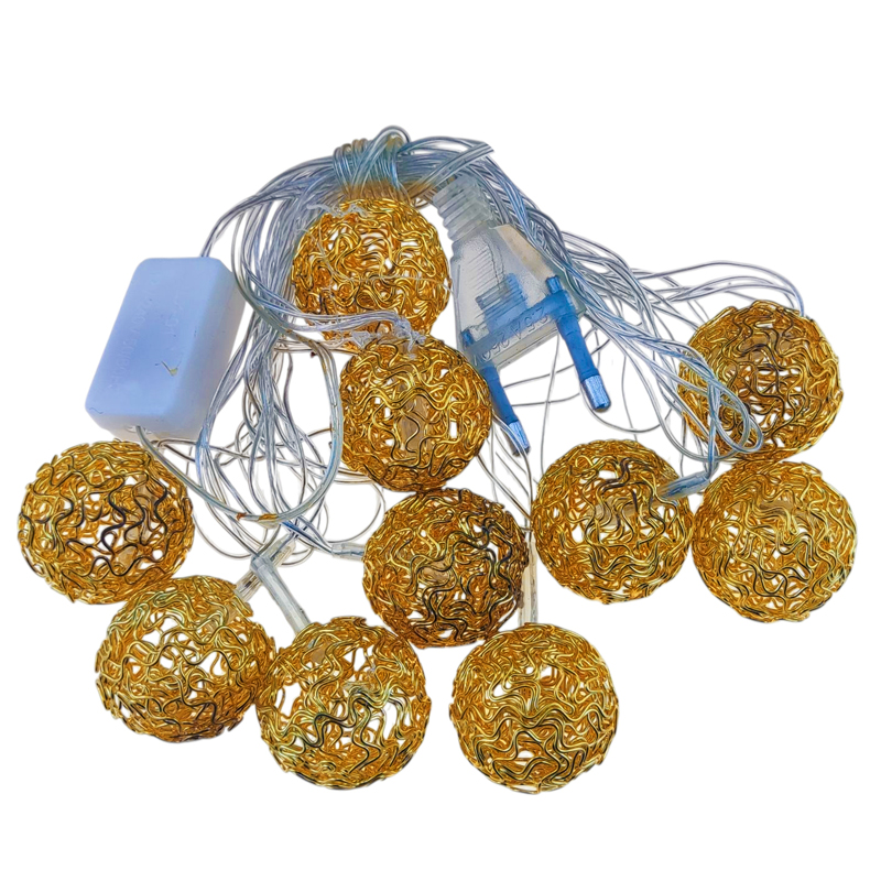 Гирлянда светодиодная 10 LED «Золотая паутинкай» Ø20мм. Элегантная гирлянда «Золотая паутинка» создаёт мягкое золотистое свечение и наполняет пространство атмосферой тепла и комфорта. Ажурные шарики, сплетённые из тонких металлических нитей, красиво отражают свет и создают игру бликов, превращая любой интерьер в по-настоящему праздничный.