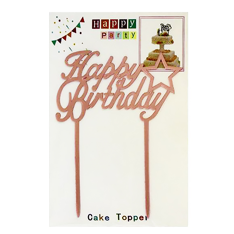 Топер для торта «Happy Birthday» №10138. Цвета золото, розовое золото и серебро
