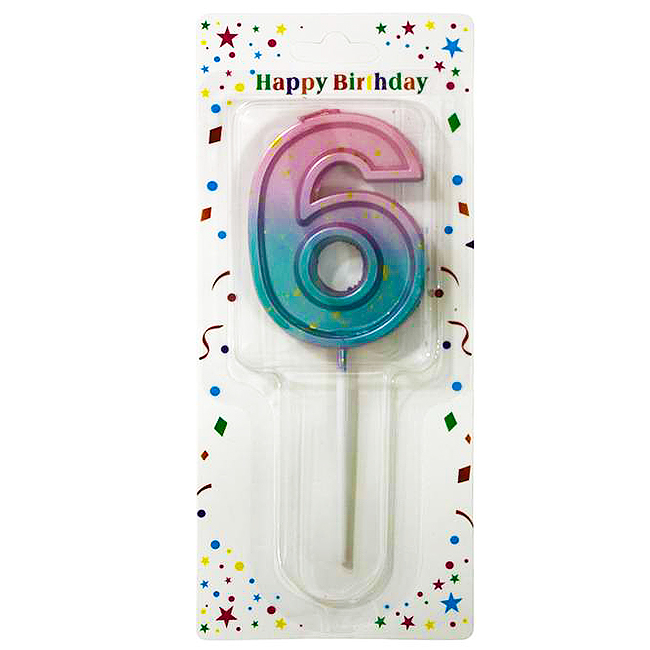 Свеча-цифра в торт «6» с градиентом и золотой поталью 7 см. Эффектная свеча в форме цифры станет ярким акцентом на праздничном торте. Градиентные переливы от розового к голубому, дополненные изящной золотой поталью, придают изделию стильный и современный вид. Высота свечи — 7 см. Это стильное украшение для торта на день рождения, юбилей или тематическую вечеринку. Идеально сочетается с другими цифрами из этой серии