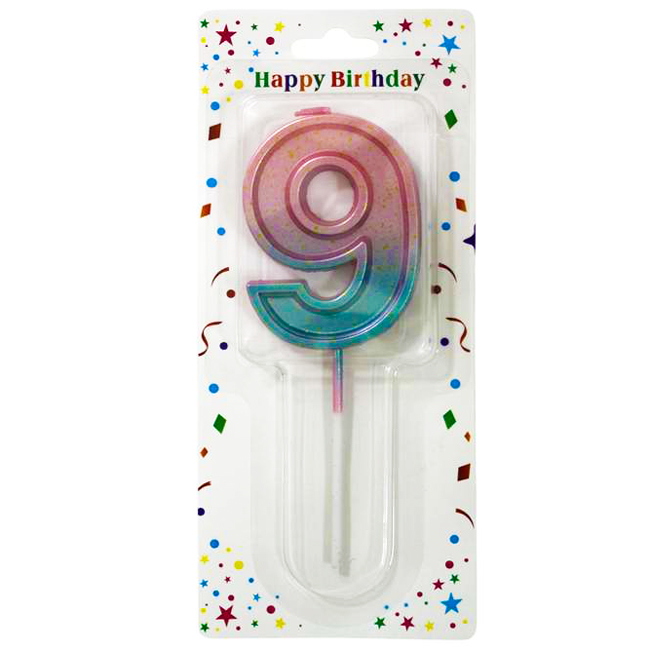 Свеча-цифра в торт «9» с градиентом и золотой поталью 7 см. Эффектная свеча в форме цифры станет ярким акцентом на праздничном торте. Градиентные переливы от розового к голубому, дополненные изящной золотой поталью, придают изделию стильный и современный вид. Высота свечи — 7 см. Это стильное украшение для торта на день рождения, юбилей или тематическую вечеринку. Идеально сочетается с другими цифрами из этой серии
