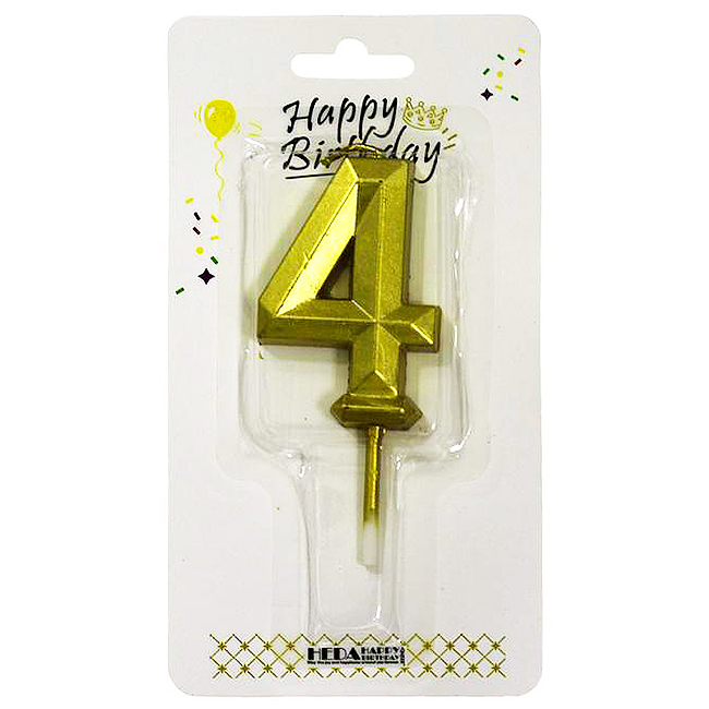 Свеча-цифра в торт «4» золотая граненая, 6 см. Стильная свеча в виде цифры с оригинальной граненой поверхностью. Объёмный 3D-дизайн с граненой текстурой и блестящим золотым покрытием создаёт эффект драгоценного камня. Устойчивая ножка позволяет легко закрепить свечу в торте. Высота свечи — 6 см. Используется для любых торжеств: дня рождения, юбилея, годовщины. Подходит для комбинирования с другими цифрами.