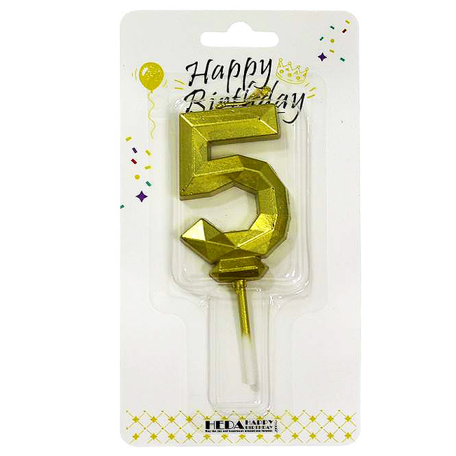 Свеча-цифра в торт «5» золотая граненая, 6 см. Стильная свеча в виде цифры с оригинальной граненой поверхностью. Объёмный 3D-дизайн с граненой текстурой и блестящим золотым покрытием создаёт эффект драгоценного камня. Устойчивая ножка позволяет легко закрепить свечу в торте. Высота свечи — 6 см. Используется для любых торжеств: дня рождения, юбилея, годовщины. Подходит для комбинирования с другими цифрами.
