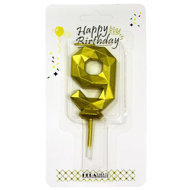 Свеча-цифра в торт «9» золотая граненая, 6 см. Стильная свеча в виде цифры с оригинальной граненой поверхностью. Объёмный 3D-дизайн с граненой текстурой и блестящим золотым покрытием создаёт эффект драгоценного камня. Устойчивая ножка позволяет легко закрепить свечу в торте. Высота свечи — 6 см. Используется для любых торжеств: дня рождения, юбилея, годовщины. Подходит для комбинирования с другими цифрами.