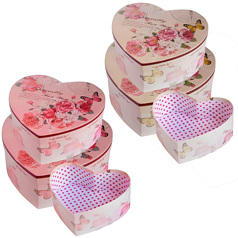 Набор подарочных коробок в виде сердца 3шт.Представлен в 2х расцветках. Разме коробок 1я- 21 х18 х 9 см., 2я- 18,5 х15,5 х 7,5 см, 3я- 15,5 х 12,5 х 6 см.
