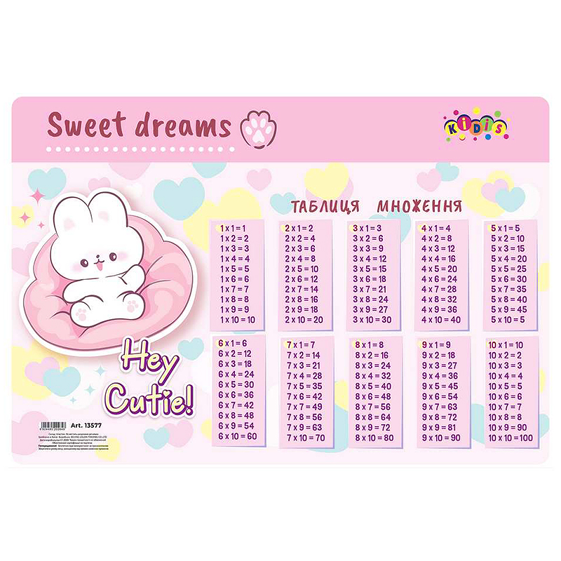 Подложка настольная с таблицей умножения 42,5 х 29 см "Hey Cutie". Яркая и функциональная настольная подложка поможет ребёнку сохранить порядок на рабочем месте и легко выучить таблицу умножения. Изготовлена из прочного пластика, устойчива к влаге и механическим повреждениям — идеально подходит для школьников младших классов. На поверхности — красочная таблица умножения и милый дизайн с персонажами, который обязательно понравится детям.