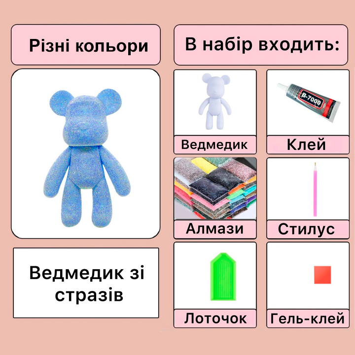 Набор для создания Алмазного мишки. Набор состоит из: фигурка мишки 21 см; стразы соответствующего цвета блестящие, круглые; карандаш; подставка-блюдце для алмазов; клей; бантик