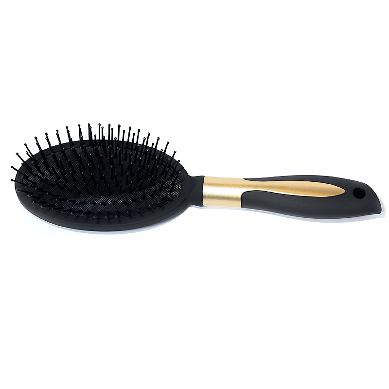 Расческа-щетка овальная №9551-23. Овальная расческа-щетка – удобный инструмент для ежедневного ухода за волосами. Эргономичная ручка с золотистыми элементами обеспечивает комфортное использование, а мягкие щетинки деликатно расчесывают волосы, предотвращая спутывание. Подходит для всех типов волос и может использоваться как дома, так и в салонах красоты.