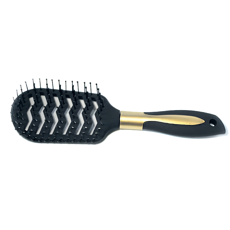 Расческа-щетка прямоугольная №9545-23. Прямоугольная расческа-щетка – удобный инструмент для бережного ухода за волосами. Эргономичная ручка с золотистыми элементами обеспечивает комфортное использование, а гибкие щетинки мягко массируют кожу головы и распутывают волосы. Подходит для всех типов волос и отлично справляется даже с густыми и длинными прядями.